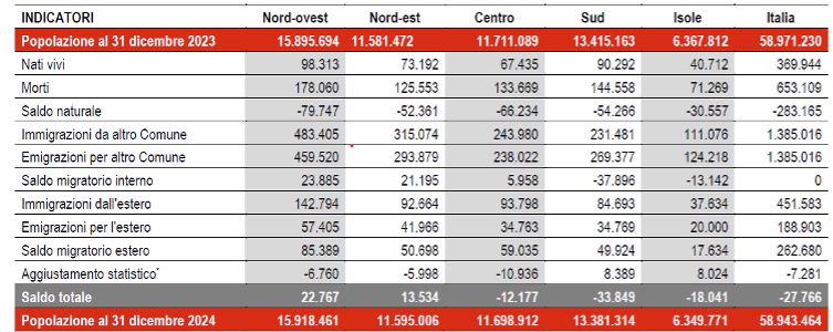 Nonostante l’aumento della popolazione straniera, il loro contributo non è sufficiente a compensare il calo della popolazione autoctona né a invertire il processo di invecchiamento complessivo. Nel 2024 il saldo migratorio è risultato positivo per 262.680 unità (451.583 immigrati a fronte di 188.903 emigrati), ma tale contributo non è stato in grado di compensare il saldo naturale, pari a -283.165 unità.