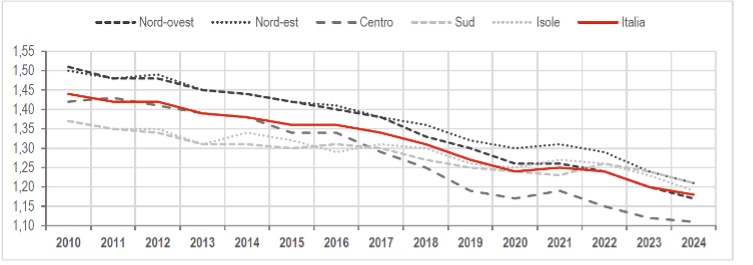 Infine, la figura 3 mostra come il tasso di natalità medio in Italia nel 2024 si attesti all’1,18 raggiungendo un nuovo minimo storico che era del 1995 (1,19). Il persistente calo della fecondità in tutte le macroaree conferma che il declino demografico italiano sia un fenomeno strutturale.