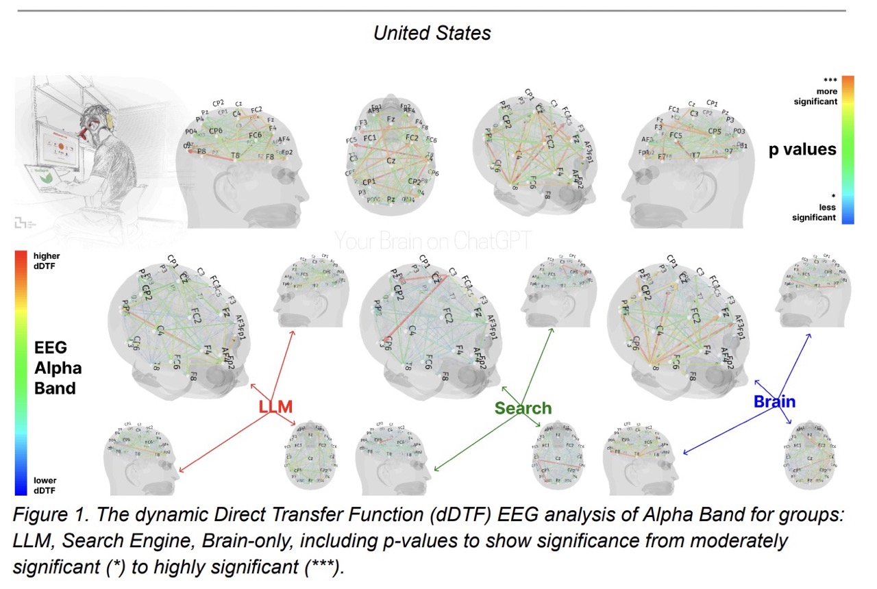 I dati raccolti suggeriscono una possibile correlazione tra l’uso di LLM e una minore attivazione di specifici pattern di attività cerebrale, nonché una produzione testuale meno originale. Tuttavia, come noto, correlazione non implica causalità. È altresì plausibile ipotizzare che la capacità di utilizzare ChatGPT in modo efficace richieda competenze distinte rispetto a quelle attivate nella composizione di un saggio ex novo, coinvolgendo circuiti corticali differenti e determinando pattern EEG diversi.