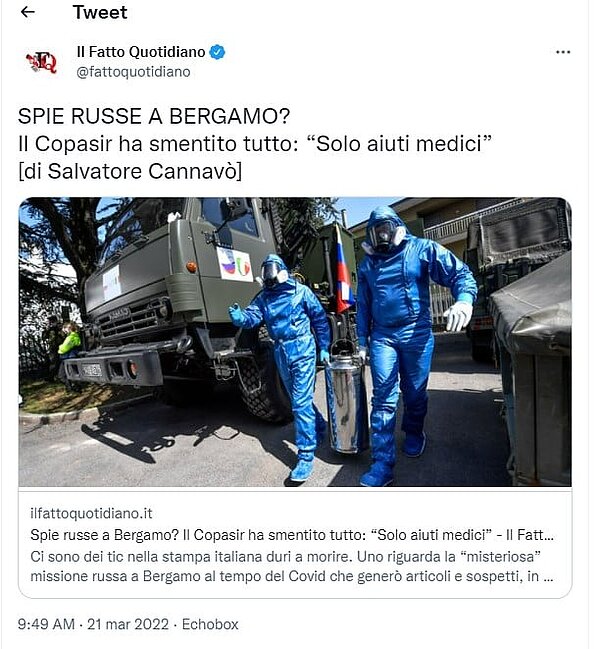 Il Fatto, questa volta a firma S. Cannavò, sposa acriticamente la posizione del Cremlino sul viaggio dei militari russi a Bergamo nel marzo 2020