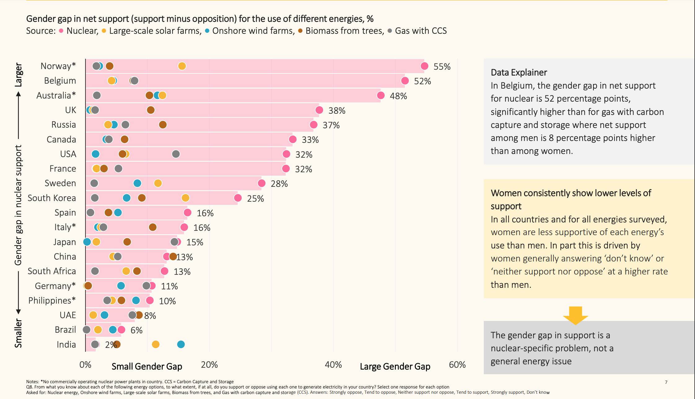 Un esempio di un divario di genere molto pronunciato si trova in Norvegia, dove le donne si mostrano generalmente molto più scettiche riguardo all'energia nucleare rispetto agli uomini. Questo potrebbe essere spiegato dal forte impegno del paese verso le energie rinnovabili, come l'idroelettrico, e dalla sua attenzione alla sostenibilità ambientale. Le donne, in particolare, potrebbero essere più influenzate dalle preoccupazioni ambientali e dalla percezione che l'energia nucleare, pur essendo a basse emissioni di carbonio, comporti rischi significativi legati alla sicurezza e alla gestione delle scorie.