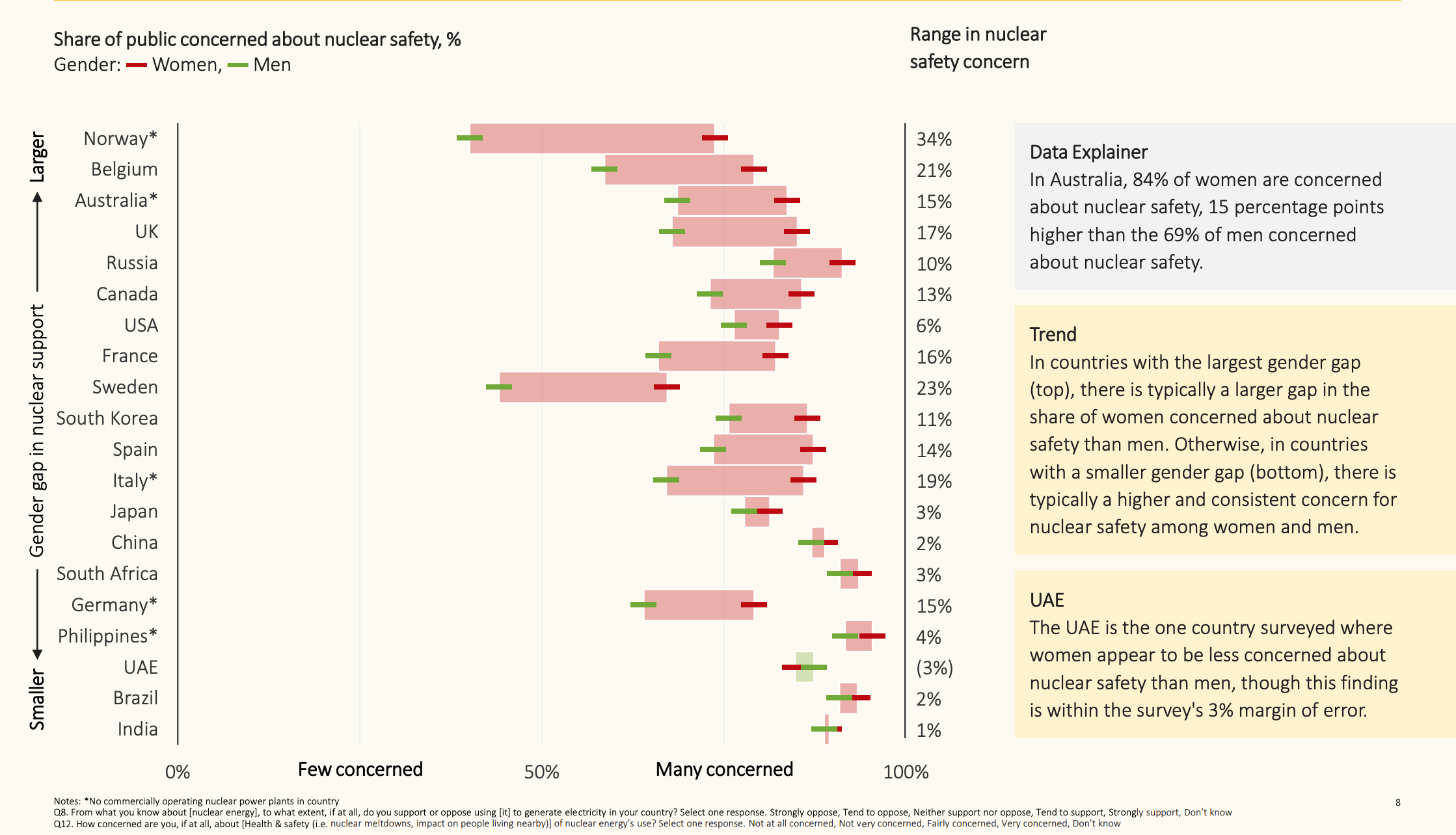 Una delle questioni in cui appare più netta l'indagine sull'energia nucleare è il divario di genere nella percezione della sicurezza nucleare. In generale, le donne sono decisamente più preoccupate rispetto agli uomini dai rischi a cui la causa energetica nucleare li potrebbe esporre. Infatti, quasi in ogni paese una percentuale nettamente superiore di donne dichiara di essere "preoccupata" o "molto preoccupata" per la questione nucleare, dal 10% fino al 15%. Un esempio significativo si osserva in Australia, dove l'84% delle donne esprime preoccupazioni per la sicurezza dell'energia nucleare, mentre solo il 69% degli uomini condivide questa preoccupazione.