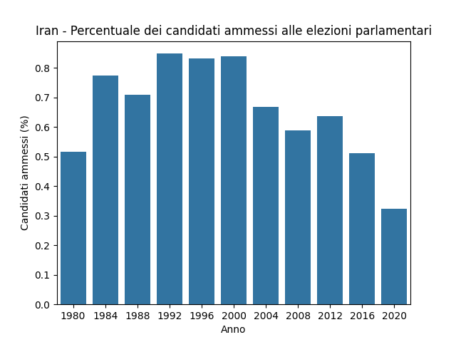 La costituzione islamica prevede infatti un Consiglio dei Guardiani di 12 membri (nominati direttamente o indirettamente dalla Guida Suprema) che ha il potere di squalificare candidati per qualsiasi elezione in Iran - potere del quale si avvale senza problemi, ed in particolare verso candidati riformisti. Nel grafico 1 si vede come il controllo del Consiglio dei Guardiani sulle elezioni sia diventato negli anni sempre più stringente, fattore che ha contribuito non poco alla disillusione politica all'interno della popolazione.