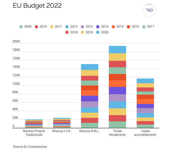 L'Italia oggi è percettore netto e lo sarà fino al 2026 per effetto del RRF (NGEU+RePower EU). Dal 2001 al 2020 è stato contributore netto. Nel grafico seguente ho riassunto i dati dal 2009 al 2020 divisi per tipologia di contributo al budget EU.