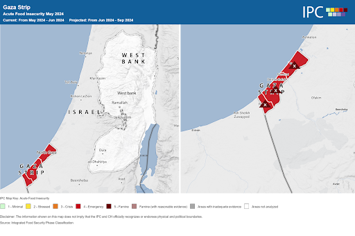 Gli aggiornamenti rispetto alla prospettiva dell’IPC parlano di un leggero miglioramento della Food Security nei governi settentrionali di Gaza dove si temeva una situazione di carestia entro fine Maggio: il migliorato accesso al cibo, tuttavia, non risulta ancora sufficiente e la situazione permane disperata secondo il WFP.