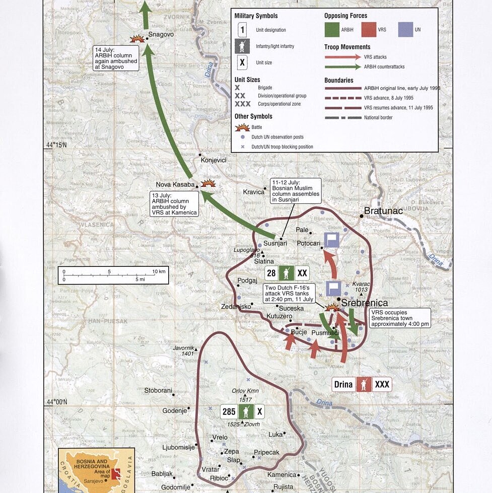 Il 9 luglio i carri armati serbi entrarono nella “zona sicura” di Srebrenica (2), superando diversi avamposti delle Nazioni Unite presidiati da soldati olandesi e prendendone 32 in ostaggio. Il tenente colonnello Karremans a Srebrenica richiese immediati attacchi aerei da parte della NATO; la richiesta venne inviata a Zagabria, dove gli ufficiali delle Nazioni Unite esitarono a prendere una decisione in merito. Anche quando due giorni dopo, l’11 luglio mattina, gli aerei NATO vennero autorizzati ad intervenire. Tuttavia, dopo aver colpito con successo due carri armati serbi, venne diramato l’ordine di sospendere con effetto immediato i bombardamenti, poiché i serbi stavano minacciando di uccidere i 32 ostaggi in loro mano. Il pomeriggio di quello stesso giorno, il generale Ratko Mladić, a capo delle unità locali dell'esercito serbo-bosniaco della Republika Srpska, accompagnato dal generale Živanović, comandante del corpo d'armata della Drina e dal generale Krstić, vicecomandante del corpo d'armata della Drina, dichiarava di aver preso ufficialmente il controllo della città (3).