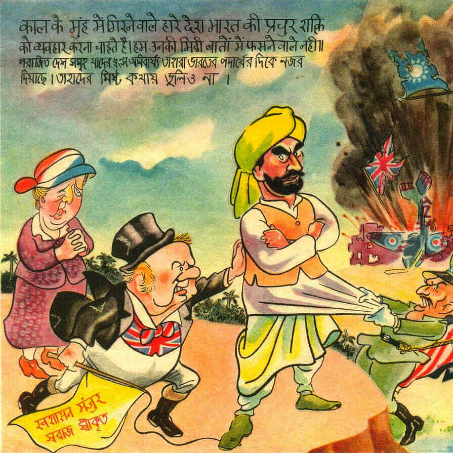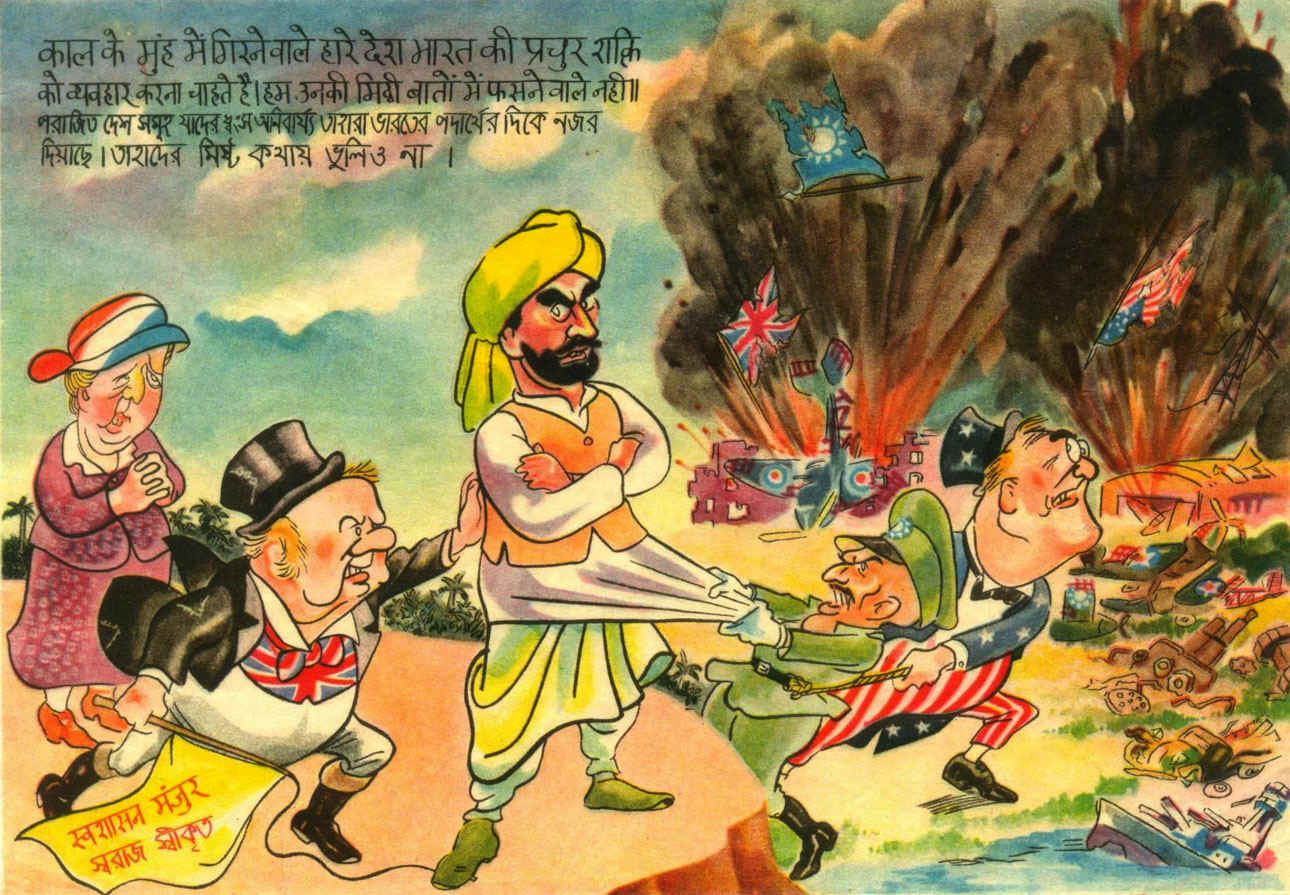 6) Volantino di propaganda giapponese raffigurante i leader alleati che cercano di spingere (Churchill) e trascinare (Chiang e Roosevelt) un indiano nella lotta contro i giapponesi, mentre Wilhelmina osserva. Fonte, Empire of Japan, Wikimedia Commons