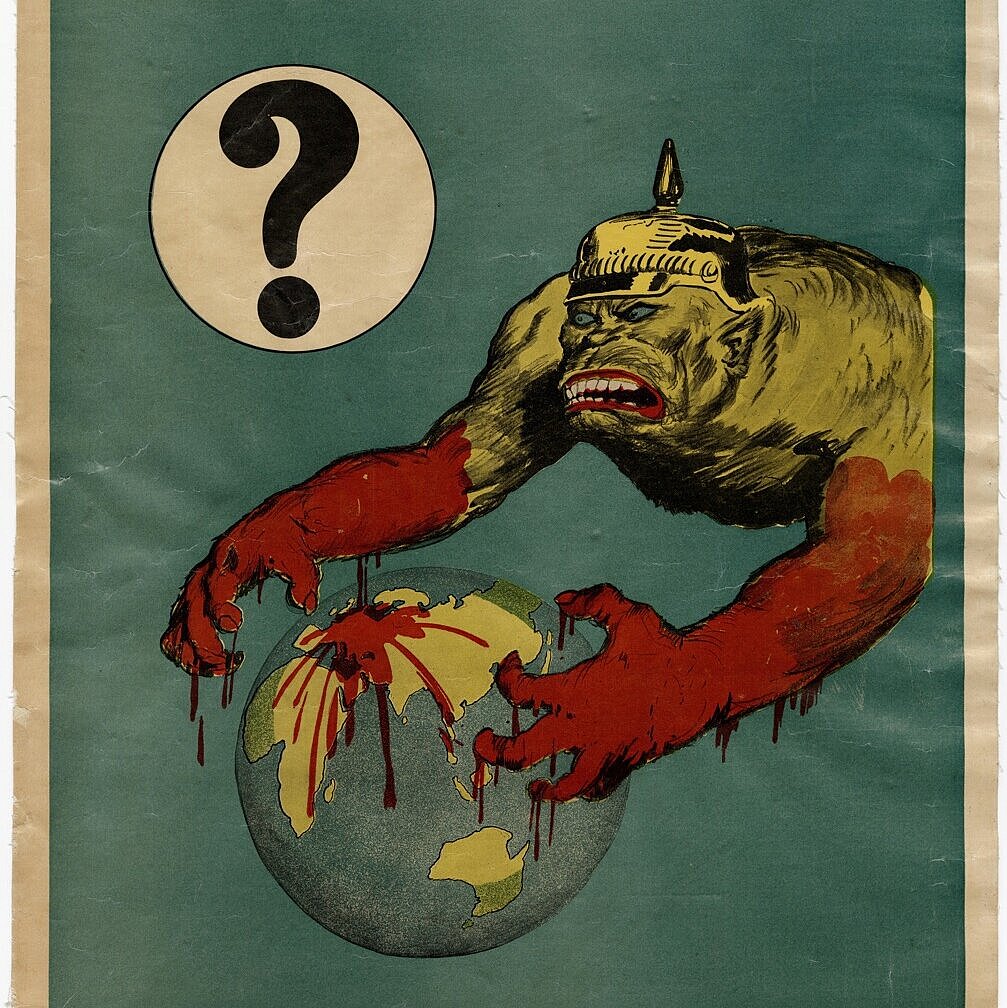 2) Litografia: Manifesto di guerra australiano della prima guerra mondiale. Il manifesto raffigura un mostro scimmia con un elmetto tedesco e mani insanguinate che si estendono intorno al globo. Fonte, Norman Lindsay, Wikimedia Commons