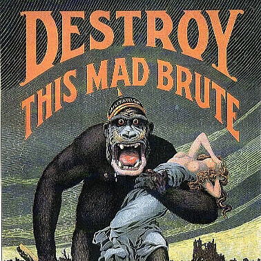 3) Un manifesto propagandistico mostra un terrificante gorilla con un casco con la scritta "militarismo", che tiene in mano una mazza insanguinata con la scritta "kultur" e una donna seminuda mentre marcia sulla costa americana. Fonte, Harry R. Hopps, Wikimedia commons