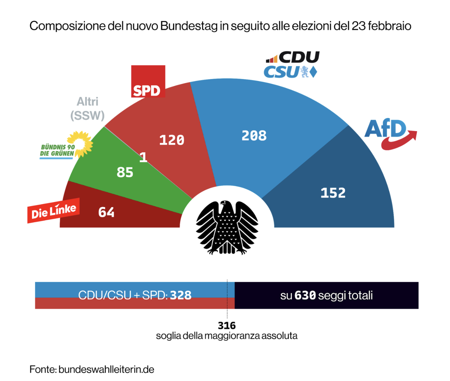 Queste sono le premesse che hanno portato il leader della CDU Friedrich Merz a intavolare delle trattative con CSU e SPD per raggiungere un accordo di governo. Il cordone sanitario invocato per escludere gli estremisti di Afd ha reso infatti l’accordo tra questi due partiti (la CSU è considerata il partito gemello della CDU in Baviera e non propriamente una forza a sé stante) inevitabile. Coalizzandosi, i due schieramenti hanno la maggioranza nel Bundestag, anche se non ampissima, mentre un accordo a due dovrebbe garantire più stabilità rispetto alla formazione tripartita precedente.
