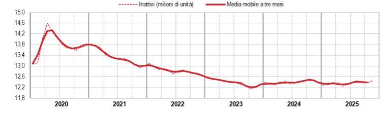 In questo secondo caso, il calo della disoccupazione non riflette un miglioramento reale delle opportunità occupazionali, ma piuttosto una riduzione della partecipazione al mercato del lavoro. Infatti, confrontando il mese di novembre con quello precedente, si osserva una riduzione sia del numero di disoccupati (–30 mila unità) sia del numero di occupati (–34 mila unità), a fronte di un aumento degli inattivi pari a 72 mila unità.