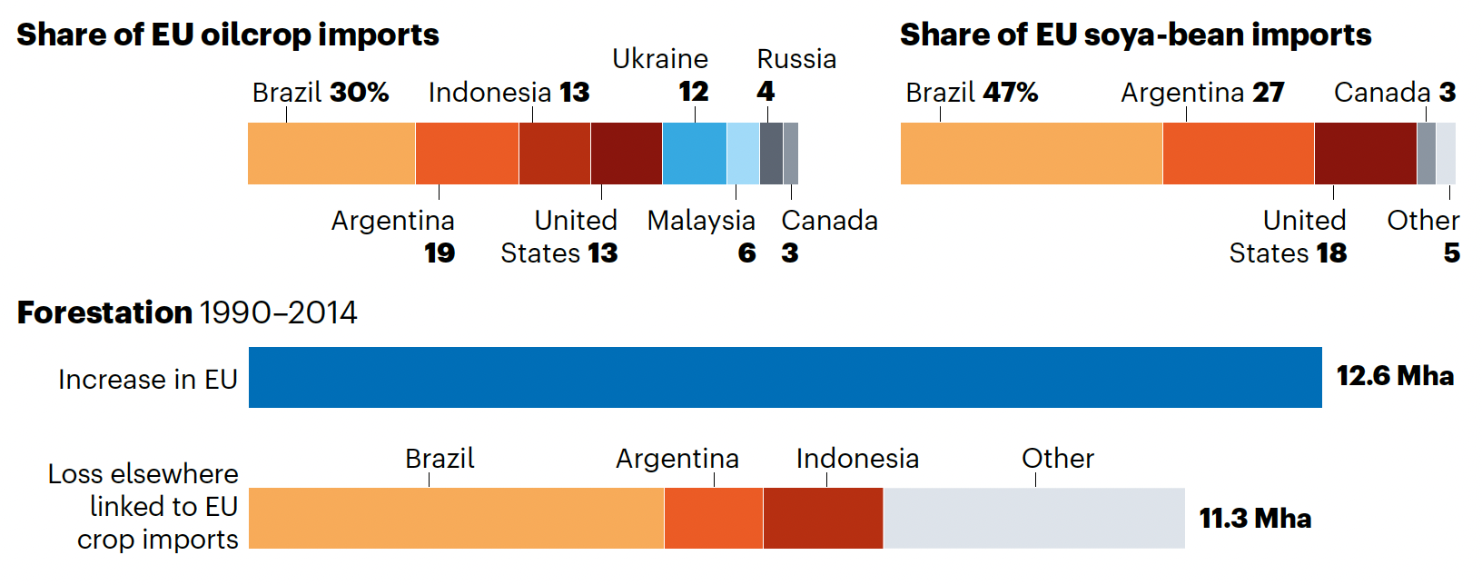 Analizzando i dati (figura sopra) possiamo notare come negli ultimi anni l’Europa abbia assistito sì a un fenomeno di rimboschimento, a discapito tuttavia di altri Paesi che, per produrre sufficiente merce da poter esportare in Europa, hanno invece deforestato.