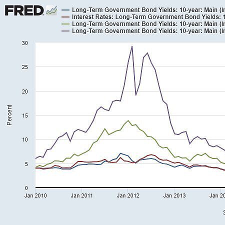 Nel grafico ci sono i rendimenti dei bond di 3 Paesi che hanno chiesto l'intervento del MES e di un Paese che non l'ha chiesto (l'Italia). Come si vede non c'è nessun effetto stigma.