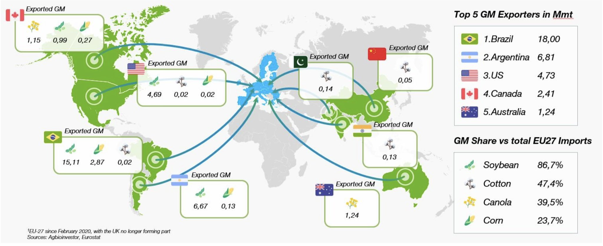 Di fatto l’Europa è diventa un importatore di OGM, in particolare l’86% della soia presente sul territorio europeo è OGM (utilizzata sia come mangime animale, sia per l’alimentazione umana), il 47,4% del cotone, quasi il 40% della canola e circa il 23% del mais sono OGM, e la maggior parte vengono dal Brasile, il quale ha aumentato il terreno utilizzato per produrre un surplus di prodotti da esportare in Europa.